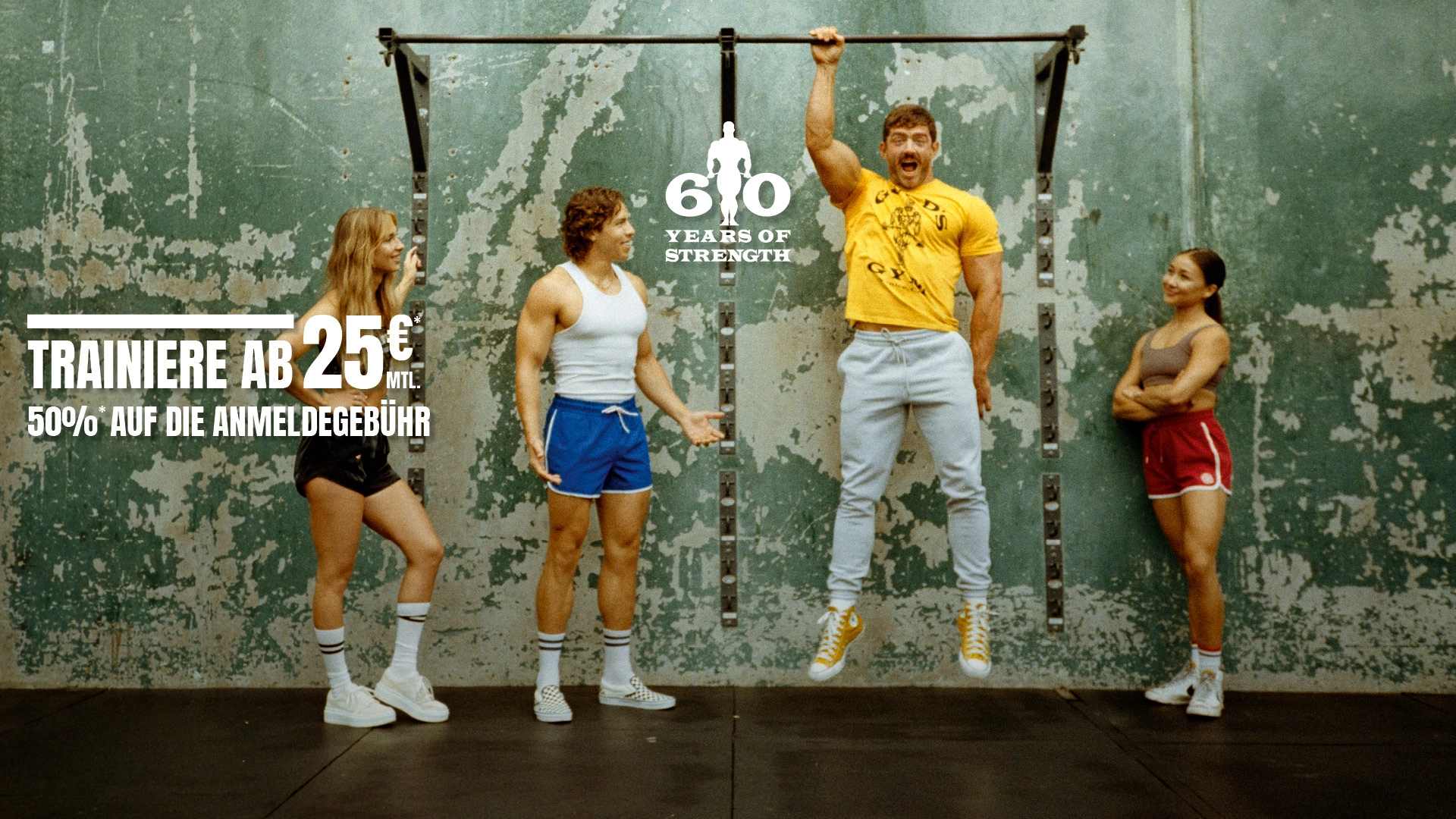 *Anniversary Deal für Kat. 1 bis 3 (Tarif 12 Monate) | Vertragsabschluss vom 06.03.2025 bis 21.12.2025 in den teilnehmenden Gold’s Gym Studios vor Ort (je von 8-22 Uhr) oder online | Mindestvertragslaufzeit 12 Monate | Mitgliedsbeitrag Kat.1: beträgt 25€ mtl. (statt 40€) | Mitgliedsbeitrag Kat.2: beträgt 30€ mtl. (statt 50€) | Mitgliedsbeitrag Kat.3: beträgt 35€ mtl. (statt 60€) | Es wird eine einmalige Anmeldegebühr von 25€ statt 50€ (=50% Ersparnis) für Verträge Kat. 1-2 und 50€ statt 100 € (=50% Ersparnis) für Verträge Kat. 3 fällig | Zu Beginn des übernächsten Monats nach Vertragsbeginn wird eine wiederkehrende Trainings- und Servicepauschale i.H.v. 15 € (Kat. 1–2) und 30 € (Kat. 3) fällig, danach jeweils alle 6 Monate | Mindestvertragslaufzeitgesamtpreis: 355 € Kat.1, 415 € Kat.2 und 530 € Kat. 3 | Der Vertrag berechtigt zur Nutzung aller Studios betrieben durch die Unternehmen der RSG Gruppe der Marke Gold’s Gym (abhängig von gewählter Kategorie), JOHN REED (abhängig vom gewählten Cluster) sowie den Studios der Marke McFIT (außer KLUB McFIT) | Nach Ablauf von 12 Monaten seit Vertragsschluss kann der monatliche Mitgliedsbeitrag einmal jährlich um 1 € pro abgelaufenem Vertragsjahr erhöht werden | Wird der Mitgliedsvertrag nicht spätestens 1 Monat vor Ende der Mindestvertragslaufzeit gekündigt, verlängert er sich auf unbestimmte Zeit und kann jederzeit mit einer Frist von 1 Monat gekündigt werden | Ausgeschlossen sind Personen, die das 15. Lebensjahr noch nicht vollendet haben | Bei Online-Vertragsschluss besteht ein 14-tägiges gesetzl. Widerrufsrecht | Alle Preise inkl. Umsatzsteuer | RSG Group GmbH, Tannenberg 4, 96132 Schlüsselfeld